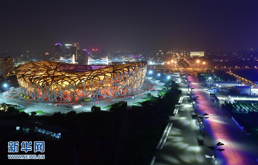 “鳥(niǎo)巢”燈光璀璨(5月14日攝)。 當(dāng)晚,一場(chǎng)“空間光影秀”在北京上演。 新華社記者 李賀 攝