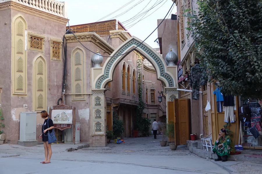 兩千多年前,這里是古疏勒國王宮所在地,從500多年前建立艾提尕爾清真寺起始,吾斯塘博依街逐漸成為一條喧鬧繁華的主街,匯聚了當(dāng)?shù)刈畛錾哪芄で山?,是名副其?shí)的手工藝品一條街。李仁奇 攝