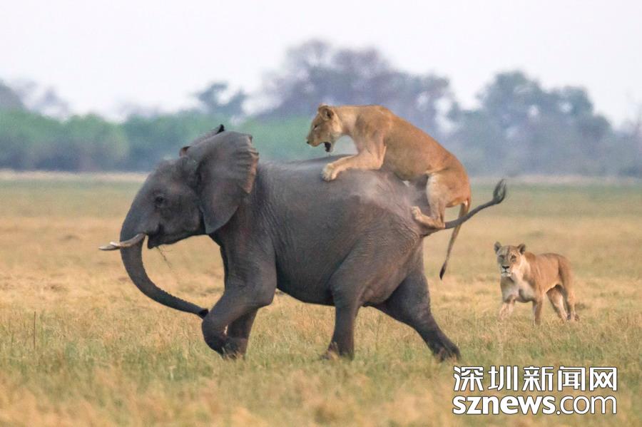 英國(guó)攝影師詹姆斯(James Gifford)在博茨瓦納喬貝國(guó)家公園拍到一群獅子獵食大象的精彩畫面。在詹姆斯的鏡頭下,一頭母獅跳到了一頭小象的背上想要將其拿下,但僅憑一己之力又不能做到。但當(dāng)母獅的后援抵達(dá)時(shí),象群也趕到了現(xiàn)場(chǎng)。最終,小象回到了象群中獲得庇護(hù),而獅群也不得不悻悻離去。