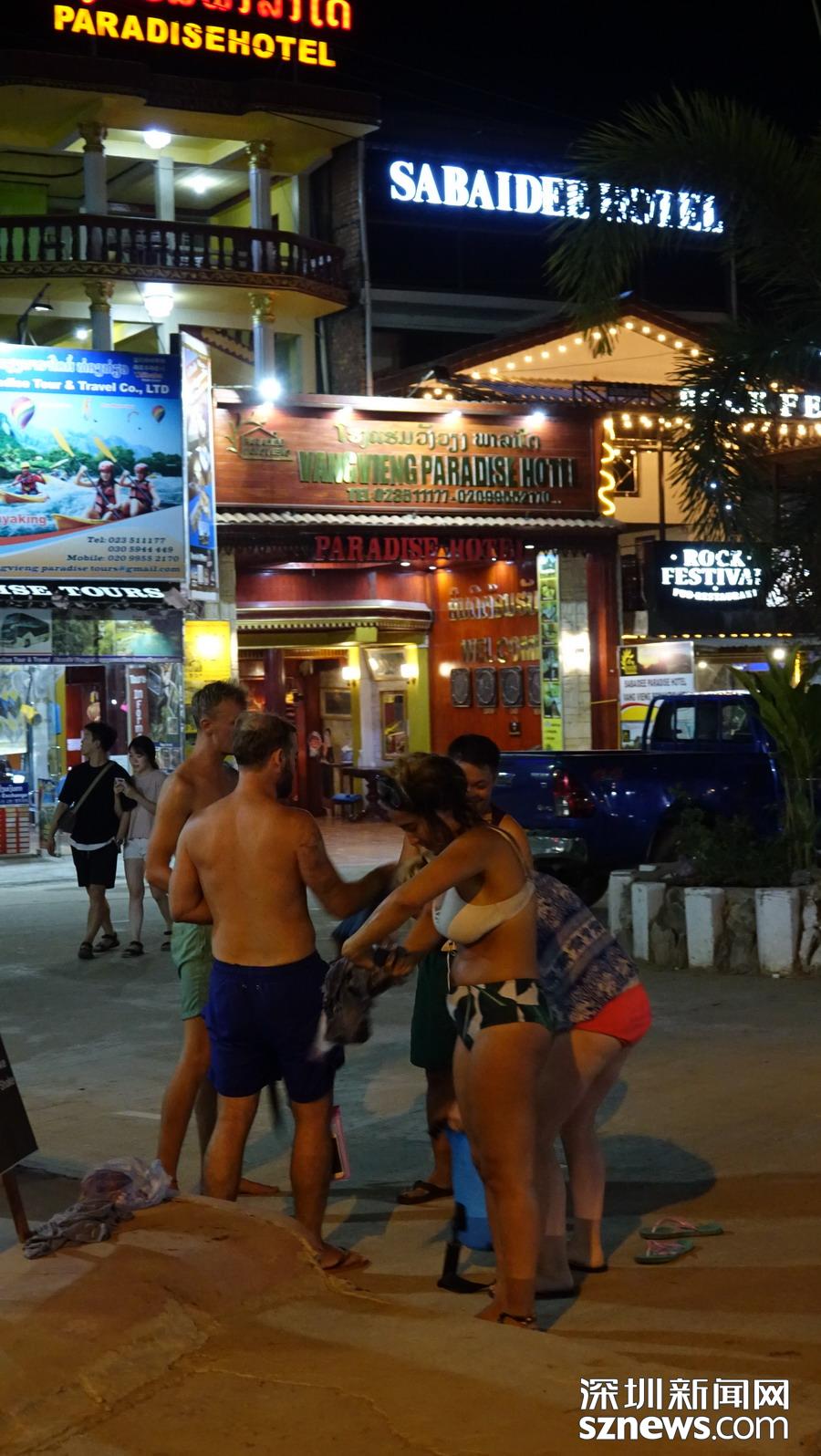 萬(wàn)榮的開(kāi)放程度很高。夜晚,南松河畔、街道兩旁都是酒吧,常??梢钥吹狡骰貋?lái)身著泳裝的“老外”當(dāng)街站立。李仁奇 攝