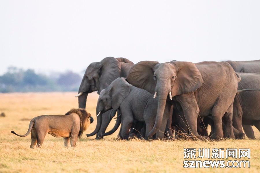 英國攝影師詹姆斯(James Gifford)在博茨瓦納喬貝國家公園拍到一群獅子獵食大象的精彩畫面。在詹姆斯的鏡頭下,一頭母獅跳到了一頭小象的背上想要將其拿下,但僅憑一己之力又不能做到。但當母獅的后援抵達時,象群也趕到了現(xiàn)場。最終,小象回到了象群中獲得庇護,而獅群也不得不悻悻離去。