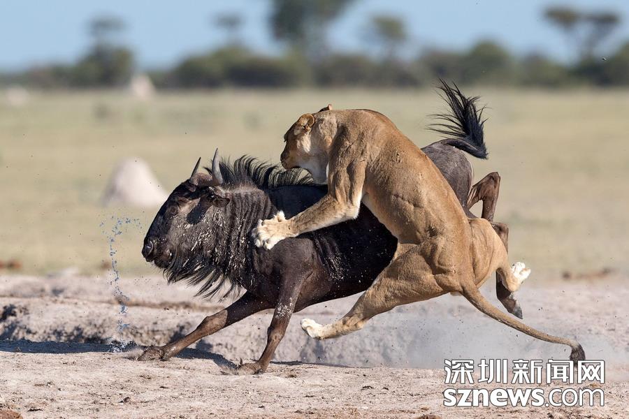 英國(guó)攝影師蘇-莫里斯(Sue Morri)在博茨瓦納Nxai Pan國(guó)家公園游玩,目睹了一場(chǎng)兇惡母獅獵食角馬的畫面。母獅甚至攀到了角馬背上,想要牢牢遏制住到手的“美餐”。強(qiáng)壯的角馬努力地與母獅抗?fàn)帲吡ο胍W∽约旱男悦?,但最終還是不敵母獅被拿下,最后成了母獅孩子們的盤中餐。
