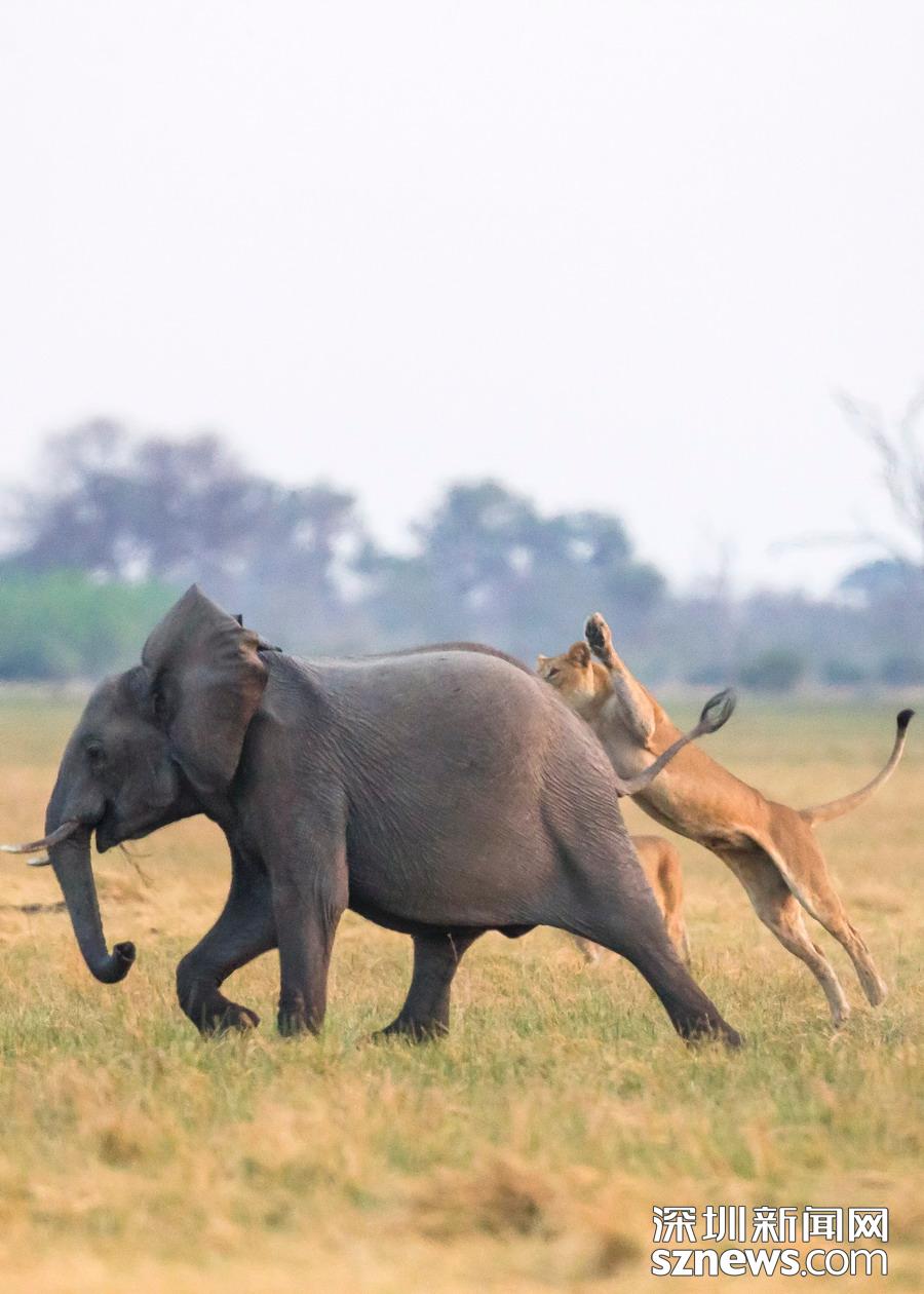 英國攝影師詹姆斯(James Gifford)在博茨瓦納喬貝國家公園拍到一群獅子獵食大象的精彩畫面。在詹姆斯的鏡頭下,一頭母獅跳到了一頭小象的背上想要將其拿下,但僅憑一己之力又不能做到。但當(dāng)母獅的后援抵達(dá)時(shí),象群也趕到了現(xiàn)場。最終,小象回到了象群中獲得庇護(hù),而獅群也不得不悻悻離去。