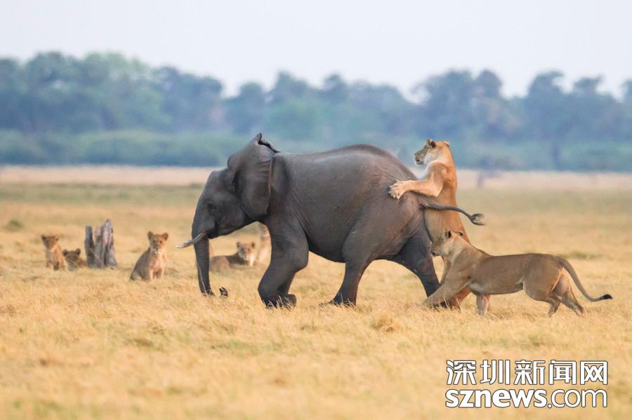 英國(guó)攝影師詹姆斯(James Gifford)在博茨瓦納喬貝國(guó)家公園拍到一群獅子獵食大象的精彩畫面。在詹姆斯的鏡頭下,一頭母獅跳到了一頭小象的背上想要將其拿下,但僅憑一己之力又不能做到。但當(dāng)母獅的后援抵達(dá)時(shí),象群也趕到了現(xiàn)場(chǎng)。最終,小象回到了象群中獲得庇護(hù),而獅群也不得不悻悻離去。