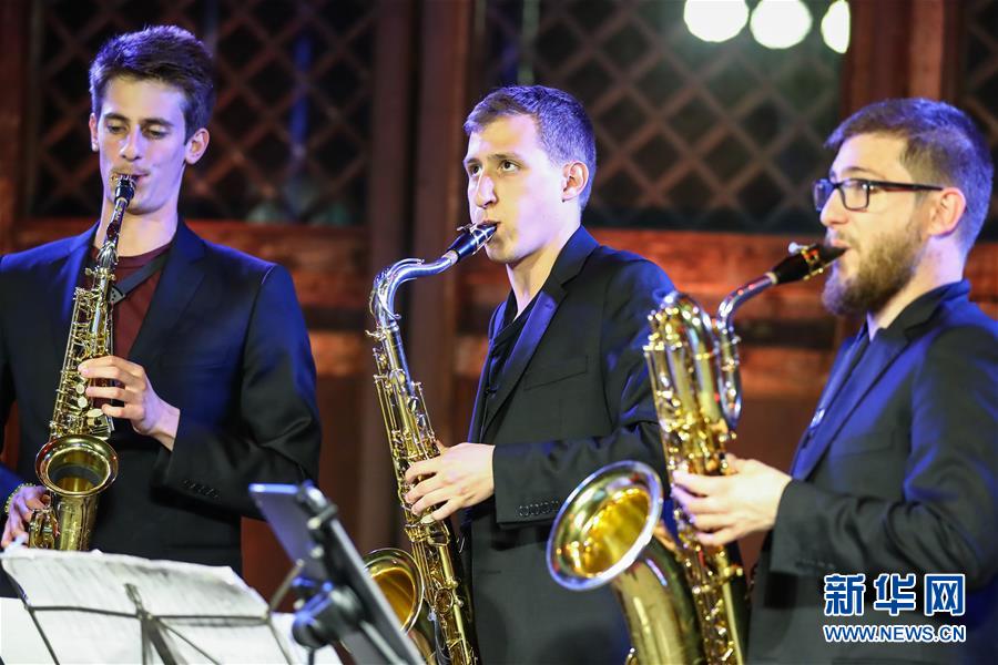 5月26日,凱比亞特樂(lè)隊(duì)成員在音樂(lè)會(huì)上表演。 當(dāng)日,作為第十九屆“相約北京”藝術(shù)節(jié)系列演出之一,西班牙凱比亞特樂(lè)隊(duì)薩克斯四重奏音樂(lè)會(huì)在北京Temple東景緣上演。 新華社記者 張玉薇 攝