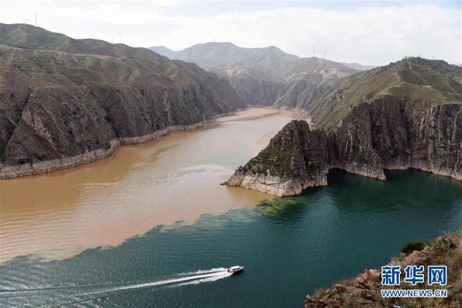 6月2日,在甘肅省臨夏回族自治州永靖縣劉家峽水庫,一艘快艇在洮河和黃河的匯合水域行駛。