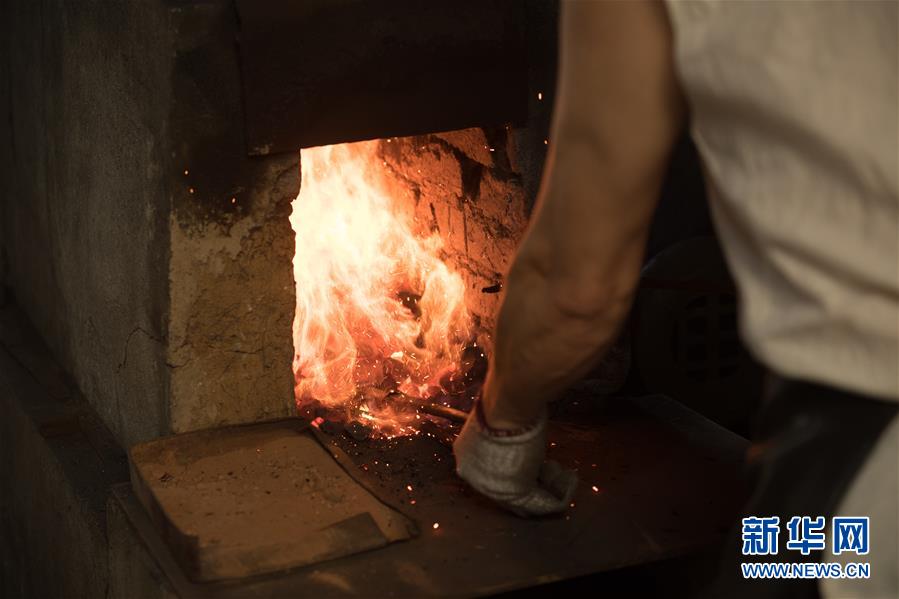 5月21日,鄭國榮在“古越劍鋪”煉制坯料。  新華社記者 翁忻旸 攝