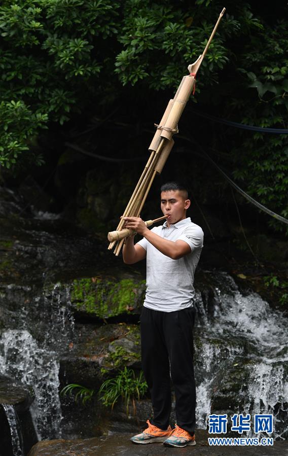 5月30日,在融水苗族自治縣安太鄉(xiāng)小桑村青山屯,杜信文在家門外試吹一把剛剛制作完成的蘆笙。 新華社記者 陸波岸 攝