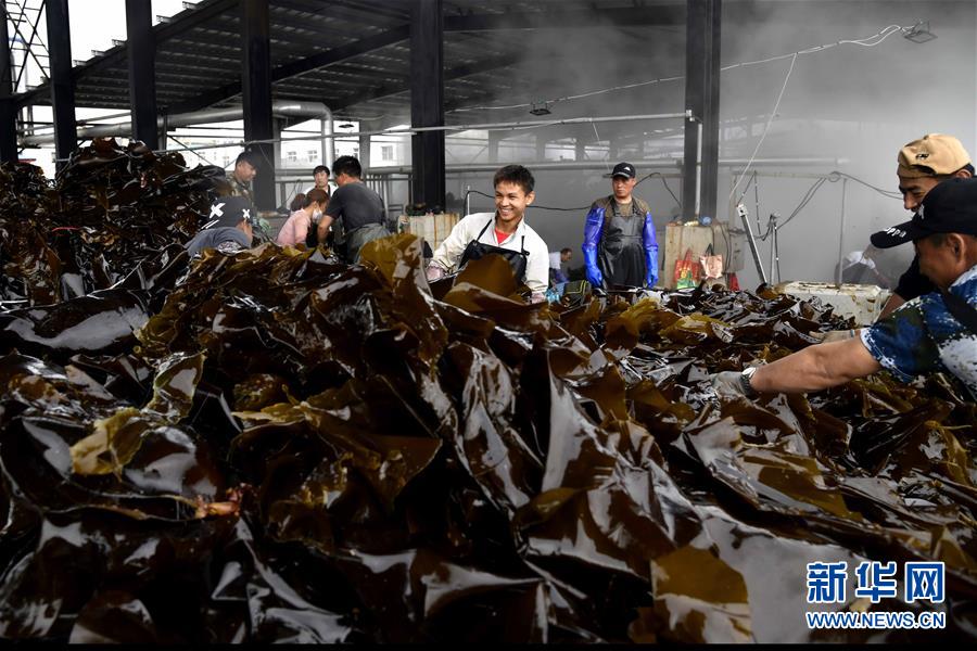 6月5日,在榮成市尋山街道青魚灘村,漁民在收獲海帶。 近日,山東省榮成市迎來海帶收獲季。據(jù)悉,榮成市海帶養(yǎng)殖面積14.5萬畝,年產(chǎn)海帶43.3萬噸以上。 新華社記者郭緒雷攝