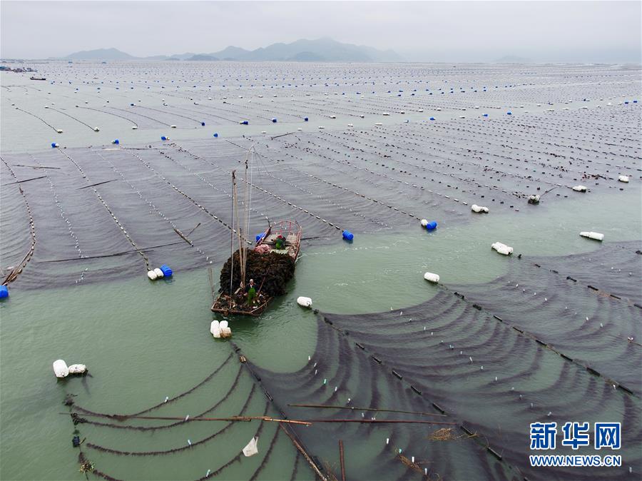 4月10日,霞浦縣長春鎮(zhèn)海域,海帶養(yǎng)殖戶在用船只運輸海帶(無人機拍攝)。近日,福建省寧德市霞浦縣30余萬畝養(yǎng)殖海帶進入收獲季節(jié),當(dāng)?shù)仞B(yǎng)殖戶搶抓晴好天氣,收獲海帶。海帶養(yǎng)殖是霞浦縣群眾增收致富的支柱產(chǎn)業(yè)。2018年該縣海帶產(chǎn)量14萬余噸。新華社記者 姜克紅 攝