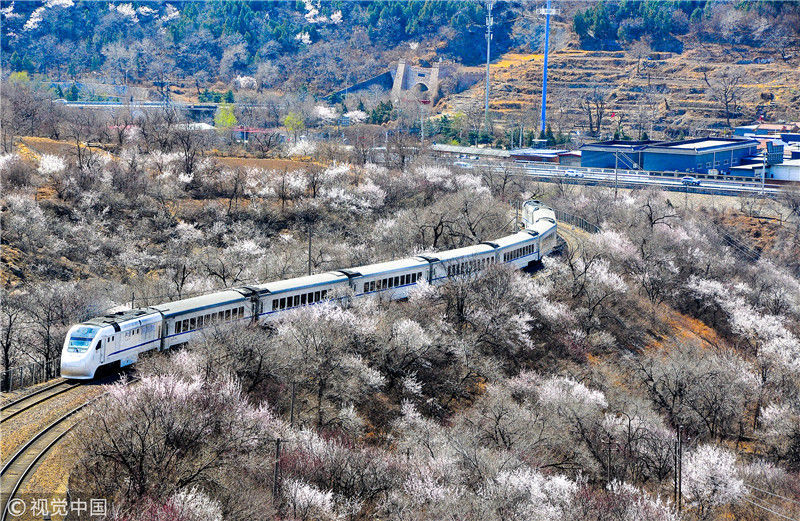 2019年3月22日,北京居庸關(guān)附近的山花盛開,S2線列車穿行在花海之中,構(gòu)成一幅美麗的畫面。