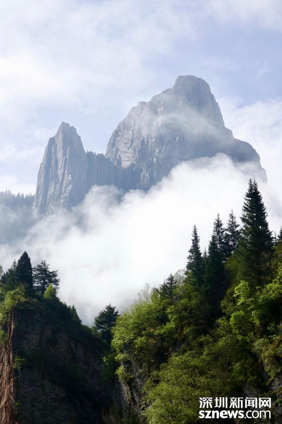 乘坐通往核心景區(qū)的旅游車進入臨近壯觀山體的地段,從獨特的角度看到了云霧繚繞的山峰,真有置身仙境的感覺。李仁奇攝