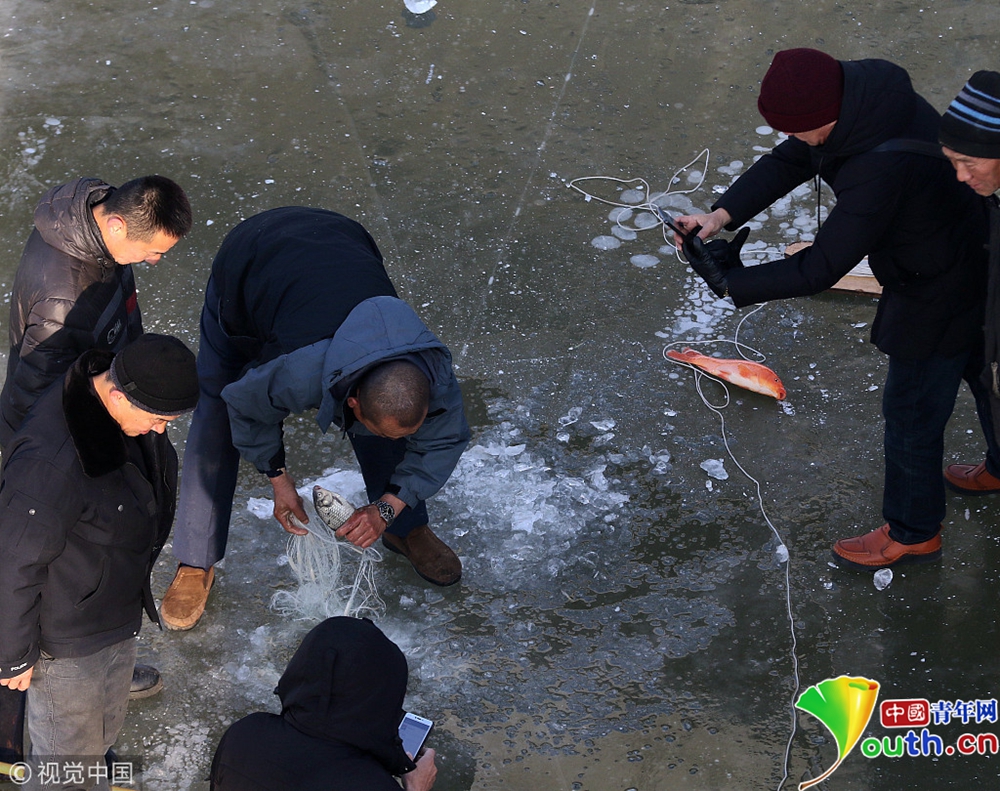 民眾鑿冰下網(wǎng)捕魚(yú)。