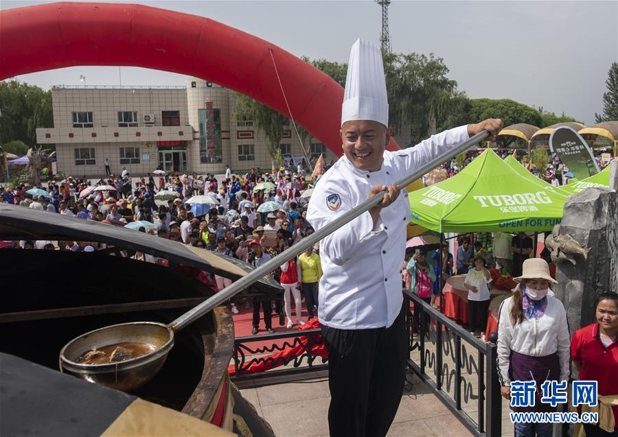 6月22日,在博斯騰湖開(kāi)湖儀式上,一名廚師舀起剛剛烹制好的魚(yú)。新華社記者 趙戈 攝