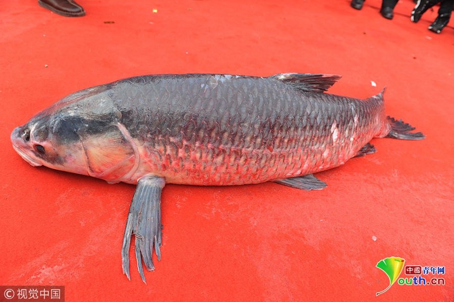 1月6日,安徽省阜陽(yáng)市潁上縣八里河漁場(chǎng)正式開(kāi)始進(jìn)行冬季大捕魚(yú),捕獲的一條重達(dá)78斤的“頭魚(yú)”拍出88萬(wàn)元,現(xiàn)場(chǎng)吸引眾多客商和廣大群眾觀看。據(jù)悉,此次所得拍賣(mài)款全部用于當(dāng)?shù)孛撠毠?jiān)。 圖片來(lái)源:視覺(jué)中國(guó)