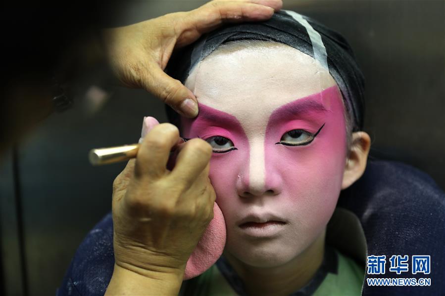 粵劇小演員陸瑞徽在畫經(jīng)典“紅白臉”妝容(6月8日攝)。 聲輝粵劇推廣協(xié)會(huì)成立于2003年,是香港重要粵劇藝術(shù)團(tuán)體之一,致力于向青少年推廣粵劇。協(xié)會(huì)目前有兩個(gè)初班,3個(gè)中班,一個(gè)青少年班?;泟∮址Q“廣東大戲”,表演技藝包括“唱做念打”,即唱功、身段、臺(tái)詞、武打,主要流行于廣東、廣西和香港、澳門等地區(qū)。2009年,粵劇被列入聯(lián)合國教科文組織人類非物質(zhì)文化遺產(chǎn)代表作名錄,今年正逢十周年。 新華社記者 吳曉初 攝