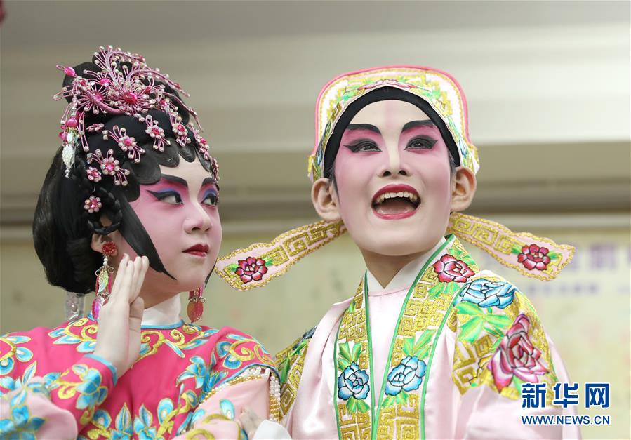 一群孩子和79歲的粵劇名伶楊劍華在一起(6月8日攝)。 聲輝粵劇推廣協(xié)會(huì)成立于2003年,是香港重要粵劇藝術(shù)團(tuán)體之一,致力于向青少年推廣粵劇。協(xié)會(huì)目前有兩個(gè)初班,3個(gè)中班,一個(gè)青少年班?;泟∮址Q“廣東大戲”,表演技藝包括“唱做念打”,即唱功、身段、臺(tái)詞、武打,主要流行于廣東、廣西和香港、澳門等地區(qū)。2009年,粵劇被列入聯(lián)合國教科文組織人類非物質(zhì)文化遺產(chǎn)代表作名錄,今年正逢十周年。 新華社記者 吳曉初 攝