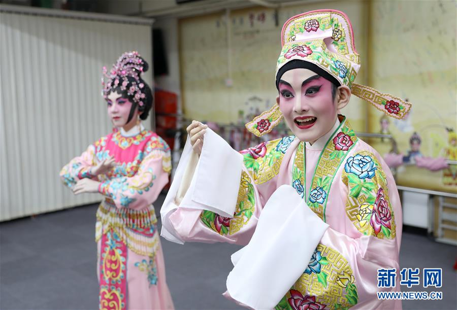 陸瑞徽(左)和利文喆在表演折子戲《艷曲醉周郎》(6月8日攝)。 聲輝粵劇推廣協(xié)會(huì)成立于2003年,是香港重要粵劇藝術(shù)團(tuán)體之一,致力于向青少年推廣粵劇。協(xié)會(huì)目前有兩個(gè)初班,3個(gè)中班,一個(gè)青少年班?;泟∮址Q“廣東大戲”,表演技藝包括“唱做念打”,即唱功、身段、臺(tái)詞、武打,主要流行于廣東、廣西和香港、澳門等地區(qū)。2009年,粵劇被列入聯(lián)合國教科文組織人類非物質(zhì)文化遺產(chǎn)代表作名錄,今年正逢十周年。 新華社記者 吳曉初 攝