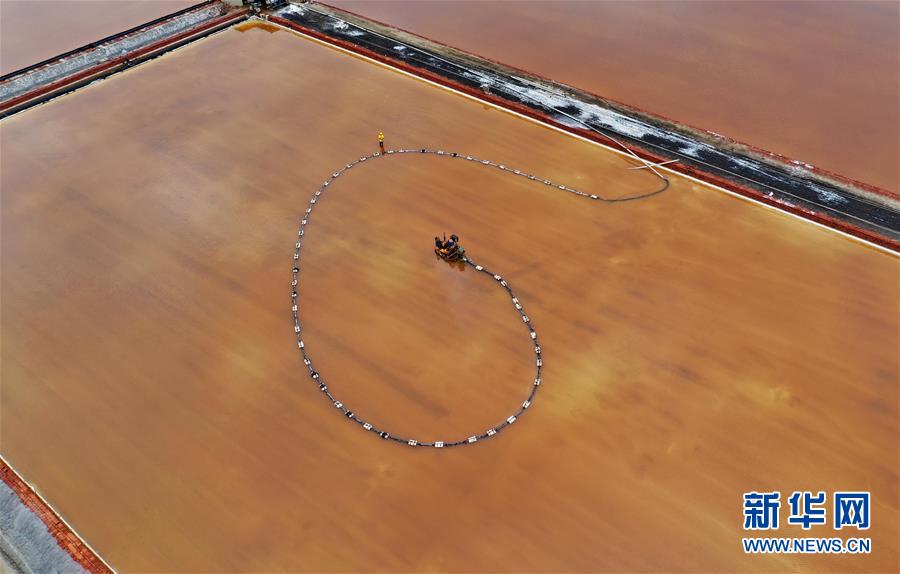 7月3日,唐山海港經(jīng)濟(jì)開(kāi)發(fā)區(qū)大清河鹽場(chǎng)的工人在操作機(jī)械設(shè)備收獲春鹽(無(wú)人機(jī)拍攝)。新華社記者 楊世堯 攝
