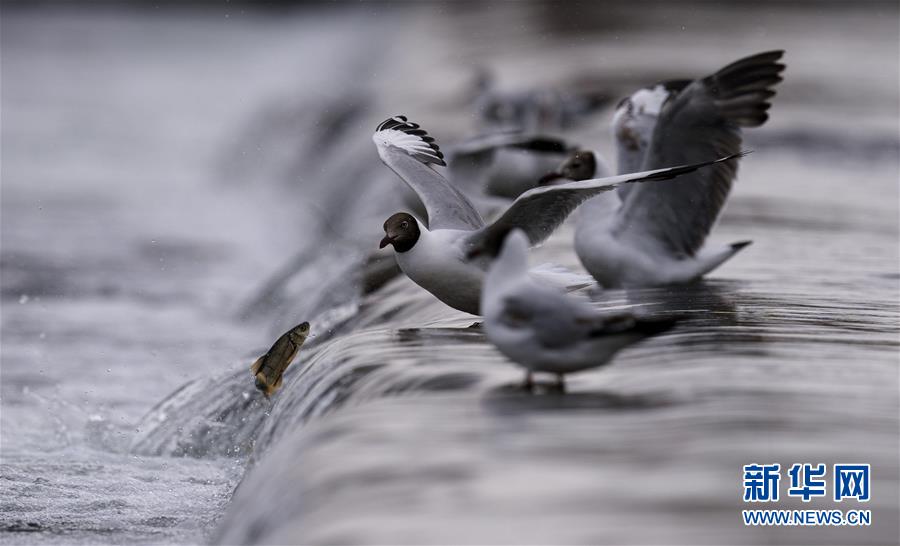 7月6日,在青海省剛察縣沙柳河里,幾只棕頭鷗在等待捕捉躍起的湟魚。 新華社記者 費茂華攝
