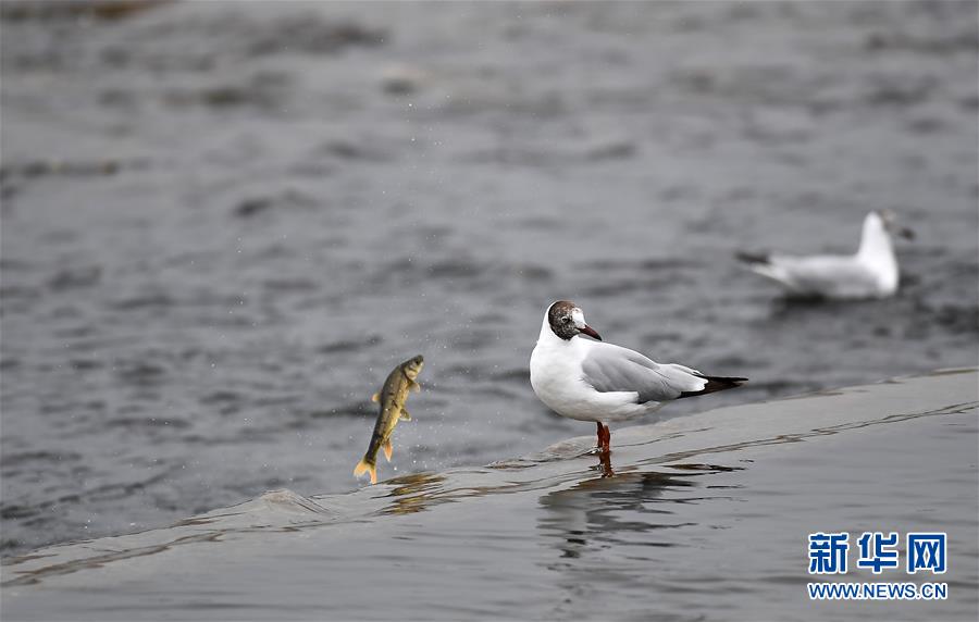 7月6日,在青海省剛察縣沙柳河里,一只棕頭鷗“錯過”一條湟魚。 新華社記者 張宏祥攝