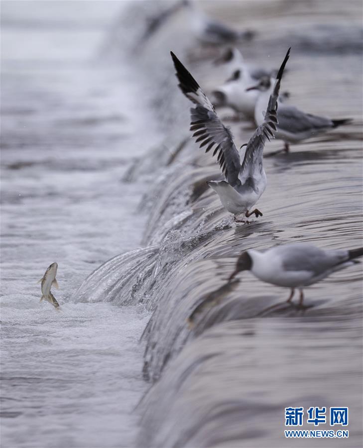 7月6日,在青海省剛察縣沙柳河里,幾只棕頭鷗等待捕捉躍起的湟魚。  新華社記者 費(fèi)茂華攝