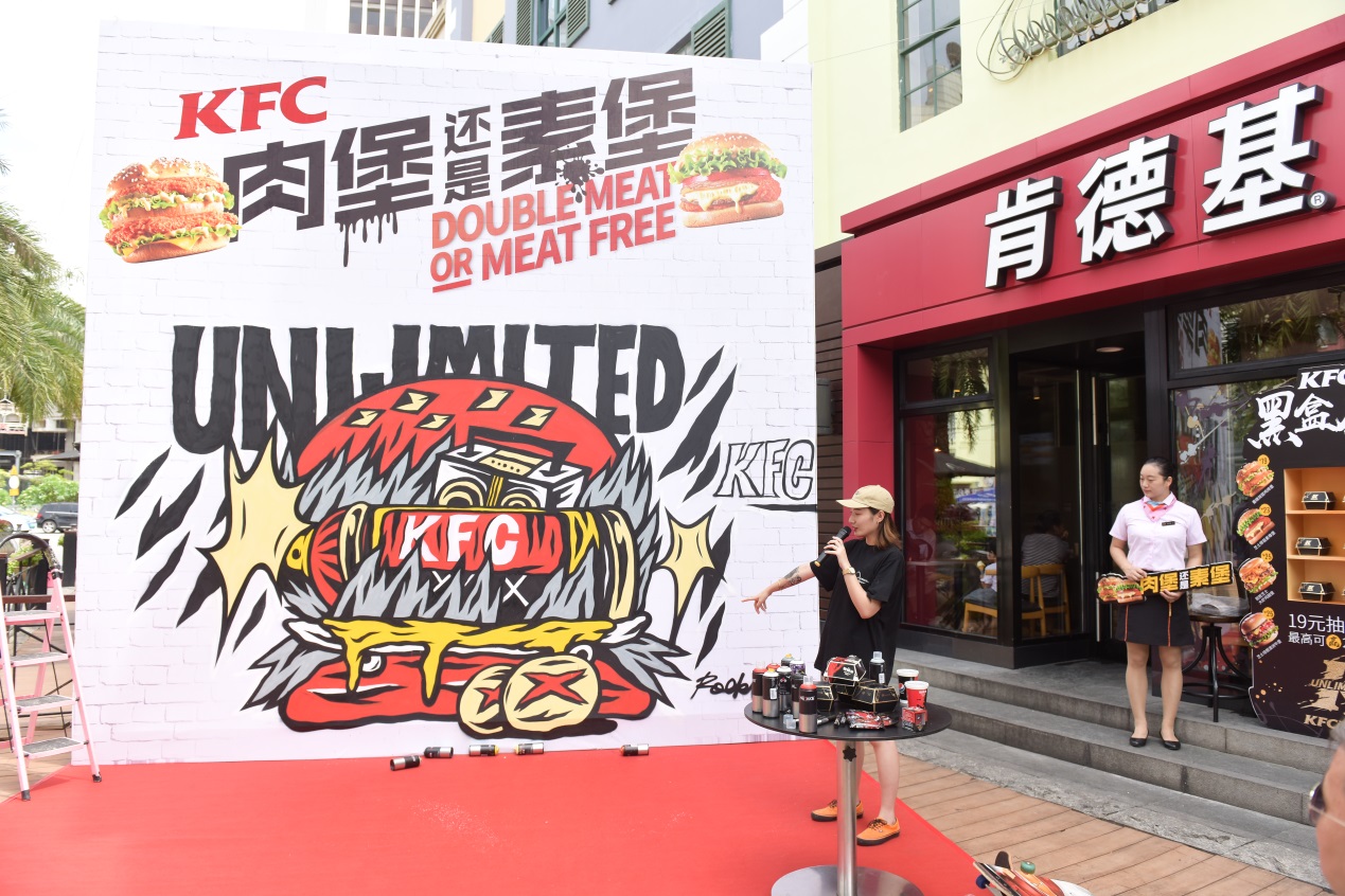 “肯德基是我非常喜歡的品牌,新潮、時尚。這一次與KFC的涂鴉合作,我在漢堡涂鴉的畫面中融入了像滑板、打碟機這樣的潮流元素,來演繹KFC厚菇堡這一款極具創(chuàng)新性的漢堡。用噴漆罐表現(xiàn)一整塊芝士厚菇,一口咬下能噴出濃郁的芝士;火焰燃燒的造型代表漢堡中肆意的醬汁,增加視覺沖擊感,呈現(xiàn)出一個沒有肉,但很real的霸氣素漢堡。”談及創(chuàng)作理念,ROCKLEE說道,“這種結合我覺得很有意義,一方面展現(xiàn)了涂鴉這種街頭文化多元的一面,另一方面也傳遞出KFC在漢堡界young OG的全新形象。”從創(chuàng)作到完工,整個過程都引來路人圍觀、拍照。從朋友圈看到消息的潮人又不斷向此聚集、花式打卡。