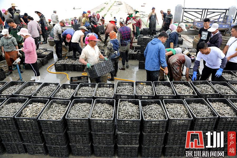 2019年7月9日,漁民們在江蘇連云港沿海地區(qū)海邊的灘涂上將剛收獲的海蟶運(yùn)送上岸裝箱外運(yùn)。