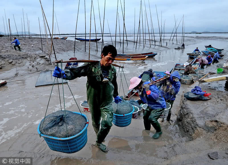 村民們冒雨和商販交易蟶苗,現(xiàn)場一片繁忙。