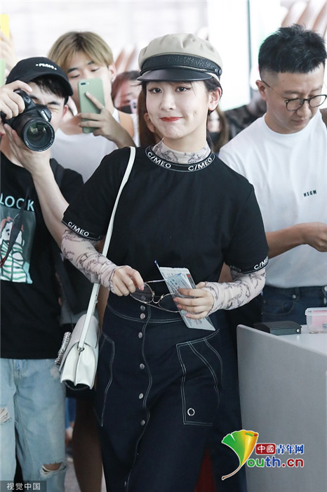 2019年7月25日,北京,楊紫現(xiàn)身機場。她穿黑色短T配牛仔裙變時髦女郎,戴報童帽架墨鏡”港風(fēng)女sir“即視感,人氣爆棚。
