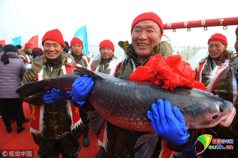 2019年1月6日,安徽省阜陽(yáng)市潁上縣八里河漁場(chǎng)正式開(kāi)始進(jìn)行冬季大捕魚(yú),捕獲的一條重達(dá)78斤的“頭魚(yú)”拍出88萬(wàn)元,現(xiàn)場(chǎng)吸引眾多客商和廣大群眾觀看。