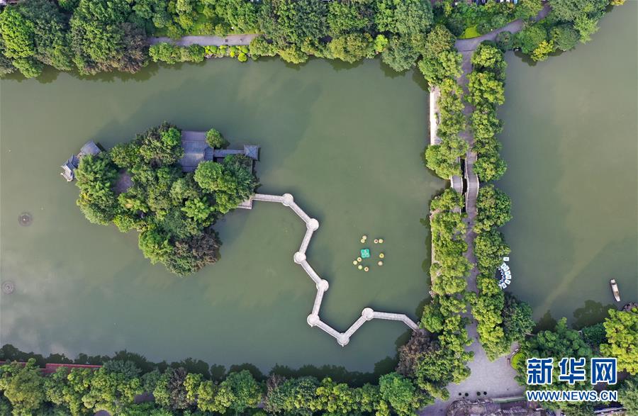 桂林市榕湖上的橋梁(7月1日無人機(jī)拍攝)。 夏日時節(jié),廣西桂林市區(qū)內(nèi)的榕湖、杉湖、桂湖、木龍湖等地綠樹成蔭、景色迷人。 新華社記者陸波岸攝