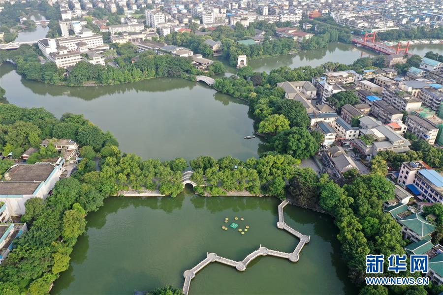 桂林市榕湖附近景觀(7月1日無人機(jī)拍攝)。 夏日時節(jié),廣西桂林市區(qū)內(nèi)的榕湖、杉湖、桂湖、木龍湖等地綠樹成蔭、景色迷人。 新華社記者陸波岸攝