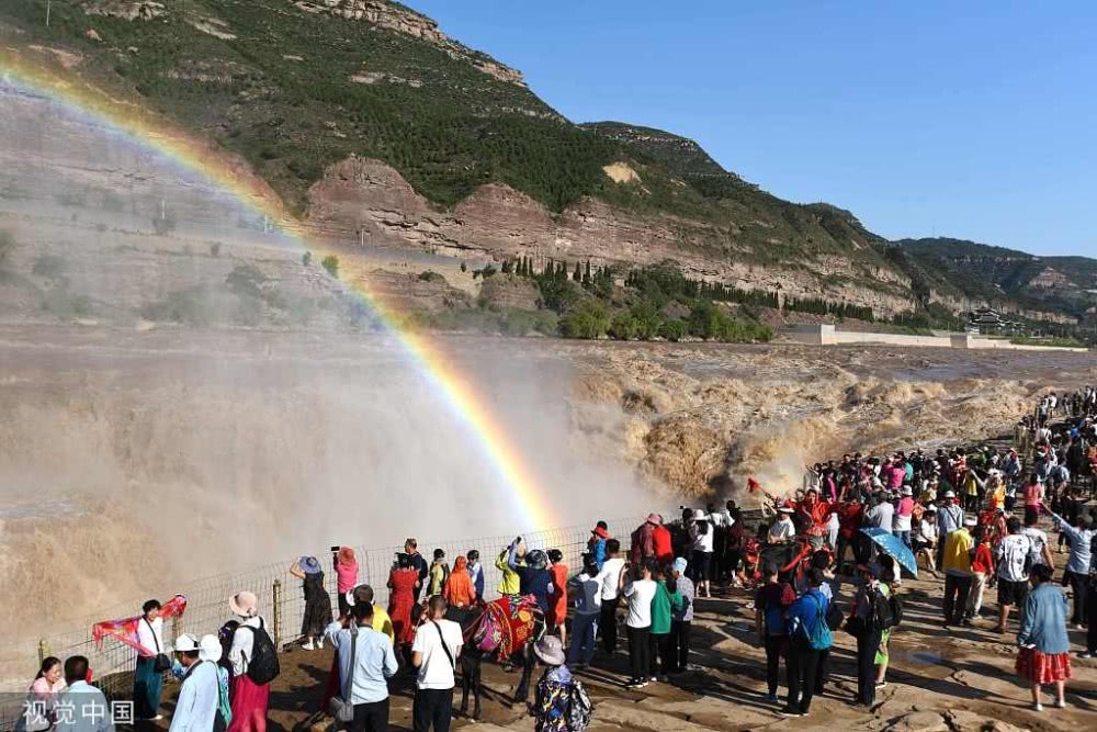 2019年8月17日,山西臨汾,游客在吉縣黃河壺口瀑布欣賞“彩虹門”景觀。