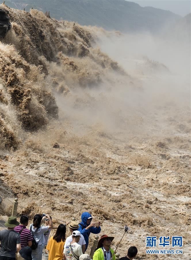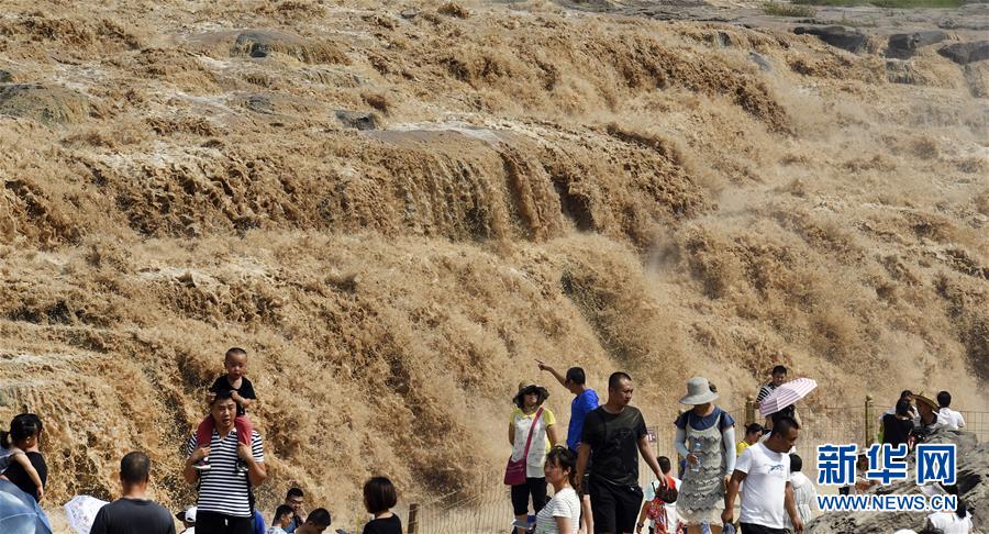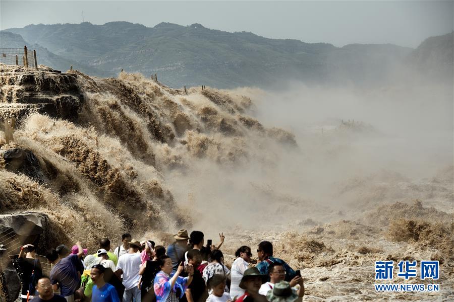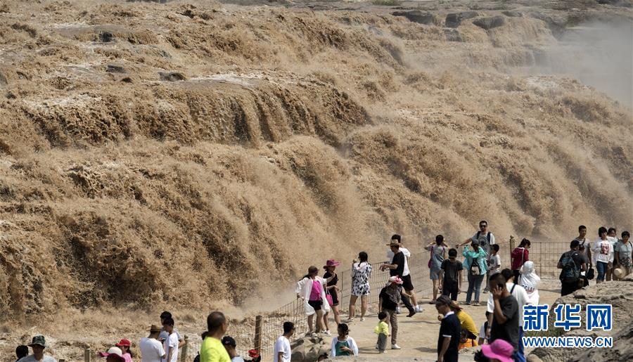 7月19日,游客在山西境內的壺口瀑布群前留影。 新華社記者陶明 攝