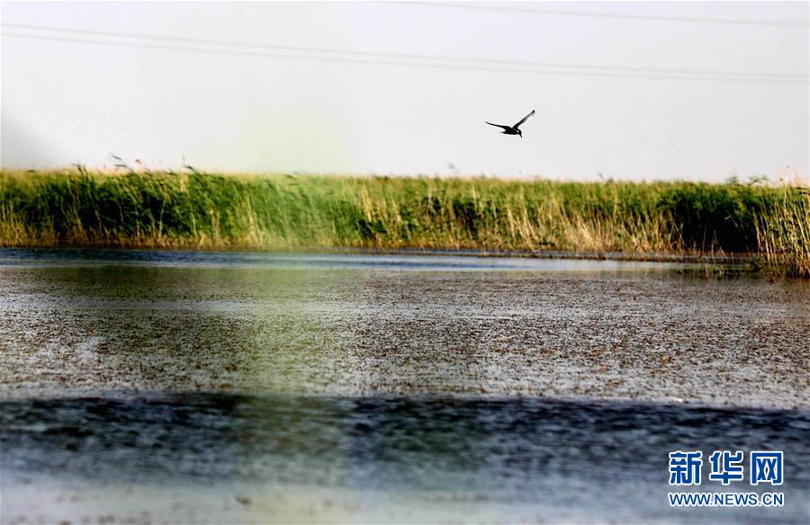 一只候鳥在青土湖水面飛翔(6月13日攝)。位于巴丹吉林沙漠和騰格里沙漠夾縫中的青土湖,是甘肅省武威市民勤縣的“沙漠之湖”,也是當(dāng)?shù)厣鷳B(tài)變遷的“晴雨表”。新華社記者 郭剛 攝