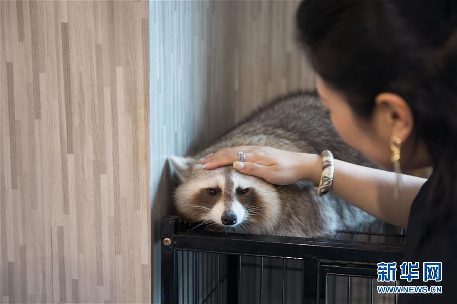 9月9日,一名顧客在曼谷動(dòng)物咖啡館和一只浣熊互動(dòng)。新華社記者 張可任 攝