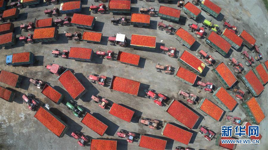 9月4日無(wú)人機(jī)拍攝的河套灌區(qū)三道橋鎮(zhèn)農(nóng)民向本地蔬菜加工廠排隊(duì)出售番茄。 新華社記者 劉詩(shī)平 攝