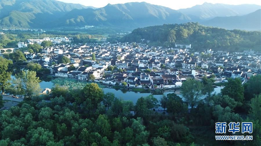 晨曦中的木梨硔村景色(9月18日無人機(jī)拍攝)。9月18日清晨,地處皖南山區(qū)的安徽省黃山市休寧縣木梨硔村沐浴在晨曦之中,靜謐祥和。新華社記者張端攝
