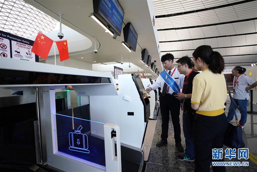9月25日,中國南方航空公司工作人員(左)在北京大興國際機(jī)場(chǎng)介紹自助行李托運(yùn)設(shè)備。新華社記者鞠煥宗攝