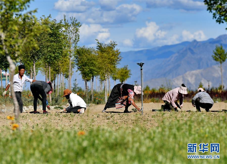 當(dāng)?shù)厝罕娫谏侥鲜性铱h藏草萬畝植物種苗繁育基地勞動(dòng)(8月29日攝)。 新華社記者 張汝鋒 攝