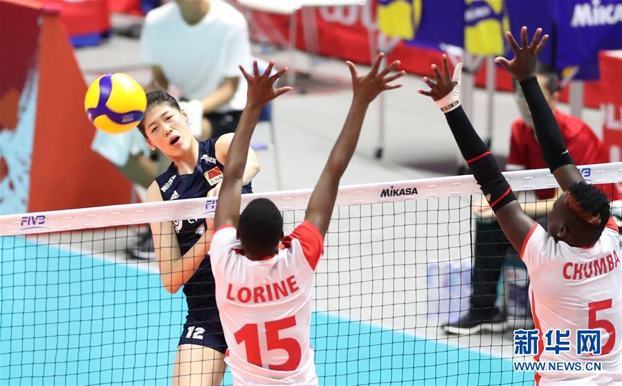 9月24日,中國隊(duì)球員李盈瑩(左)在比賽中扣球。新華社記者杜瀟逸攝