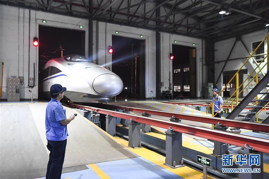 “動(dòng)車醫(yī)生”在南寧動(dòng)車所檢查庫(kù)迎接列車(10月2日攝)。 新華社記者 曹祎銘 攝