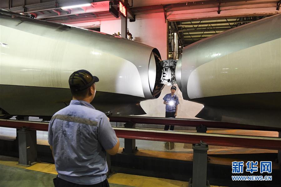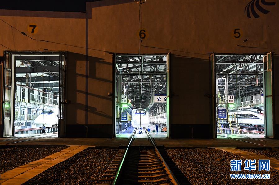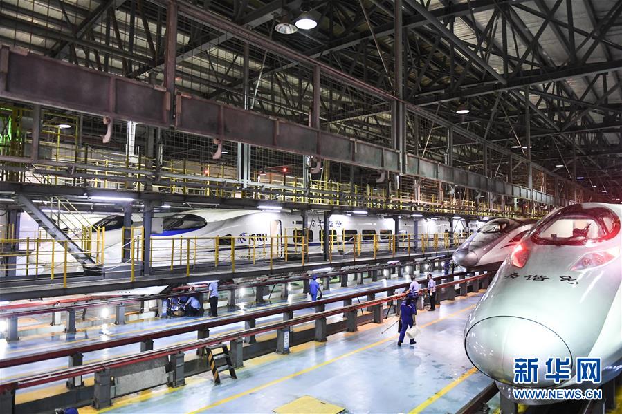 “動(dòng)車醫(yī)生”們?cè)谀蠈巹?dòng)車所檢查庫(kù)內(nèi)忙碌(10月2日攝)。 新華社記者 曹祎銘 攝