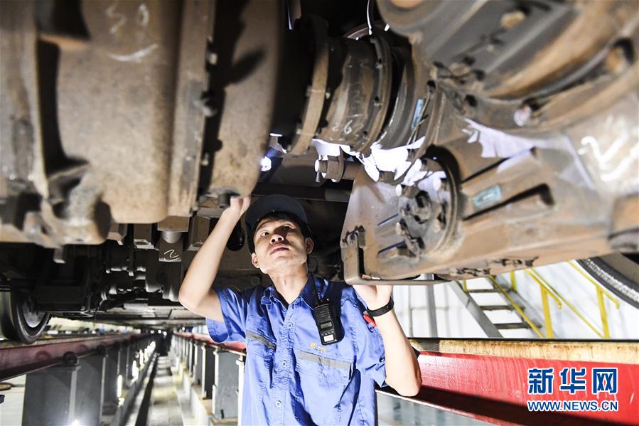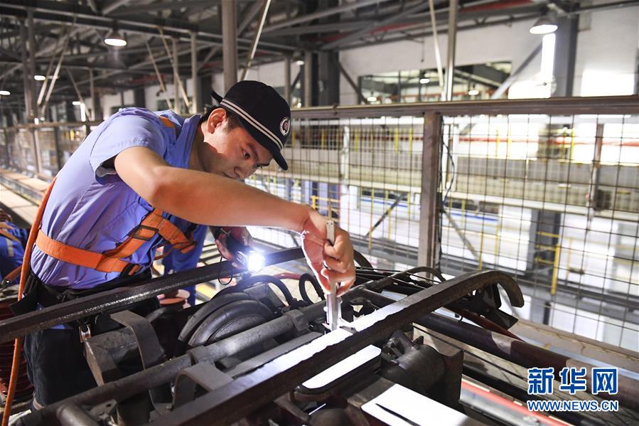 “動(dòng)車醫(yī)生”在地溝內(nèi)對(duì)動(dòng)車進(jìn)行檢查(10月2日攝)。 新華社記者 曹祎銘 攝