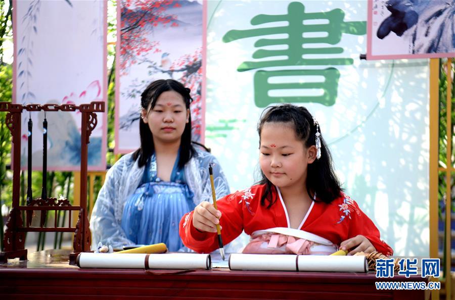 10月3日,在河北邯鄲市磁縣方特主題公園內(nèi),游客在練習(xí)書法。 當(dāng)日是國慶假期第三天,人們紛紛走出家門,樂享假期。 新華社記者 王曉 攝
