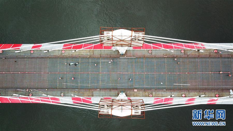 正在進(jìn)行橋面鋪裝施工作業(yè)的黑河到布拉戈維申斯克黑龍江(阿穆?tīng)柡樱┐髽颍?月19日無(wú)人機(jī)拍攝)。新華社記者 王建威 攝