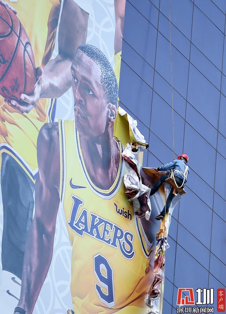 2019年10月9日,上海,“2019NBA球迷之夜”取消,上海正大廣場外圍巨幅NBA中國賽海報被拆除。