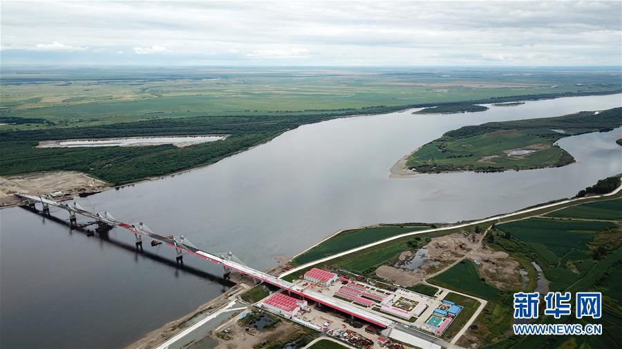 正在進(jìn)行橋面鋪裝施工作業(yè)的黑河到布拉戈維申斯克黑龍江(阿穆爾河)大橋(8月19日無人機(jī)拍攝)。新華社記者王建威攝