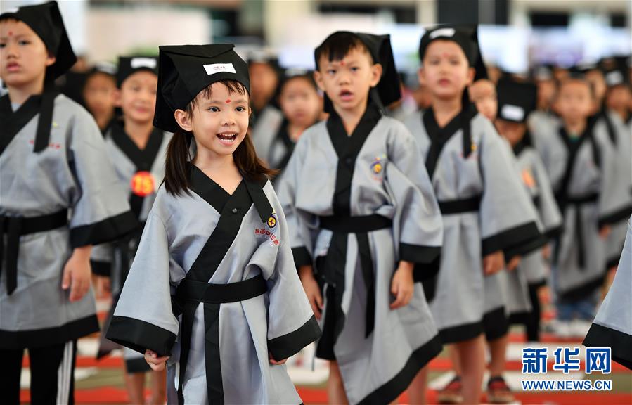 10月13日,參加儀式的小朋友在誦讀《三字經(jīng)》。當(dāng)日,??诤嬌賰核囆g(shù)中心為500名小朋友舉行“開筆禮”,通過“點(diǎn)朱砂,啟智慧”“習(xí)書法,描人字”等儀式讓孩子們體驗(yàn)中國(guó)傳統(tǒng)文化。新華社記者郭程攝